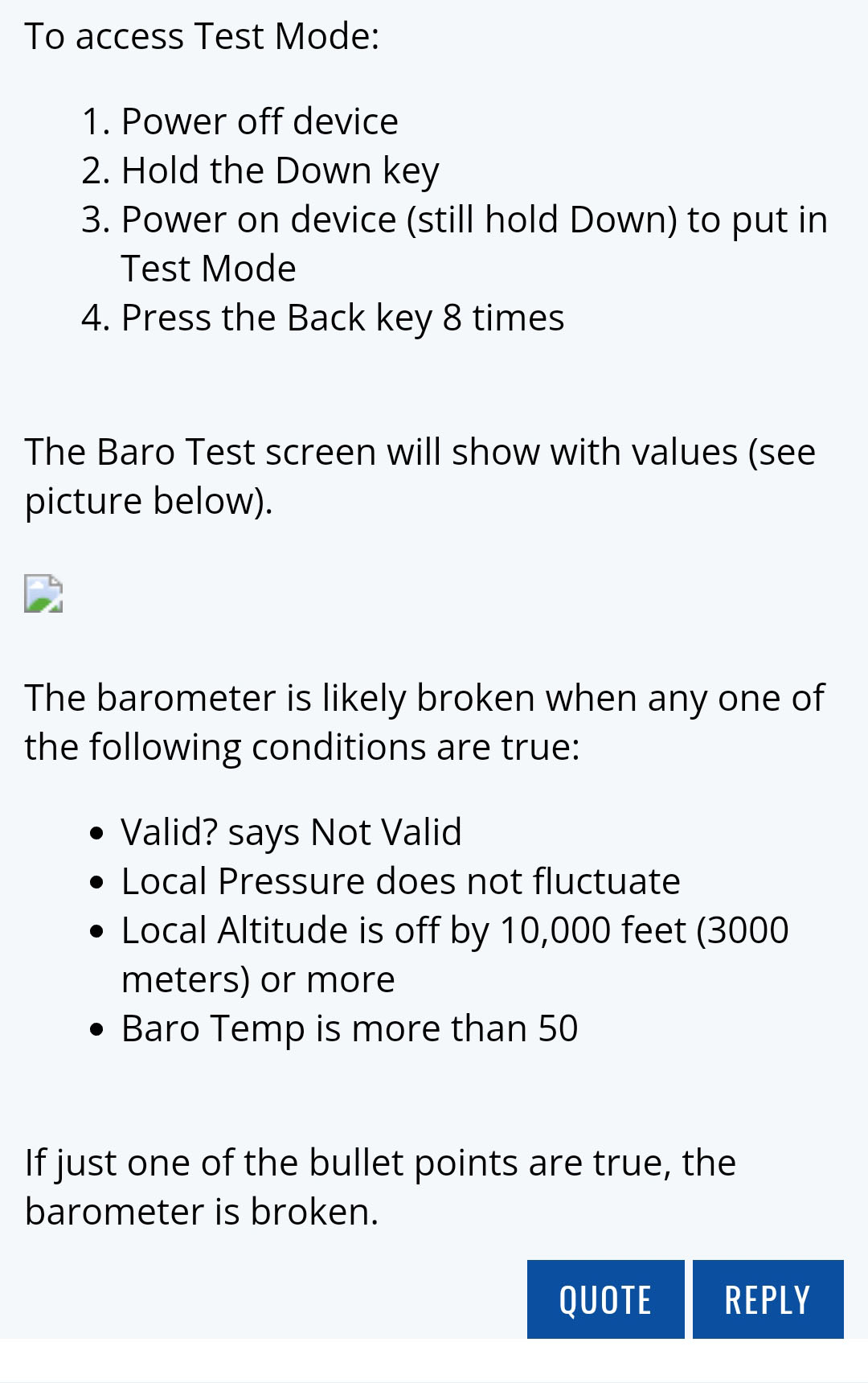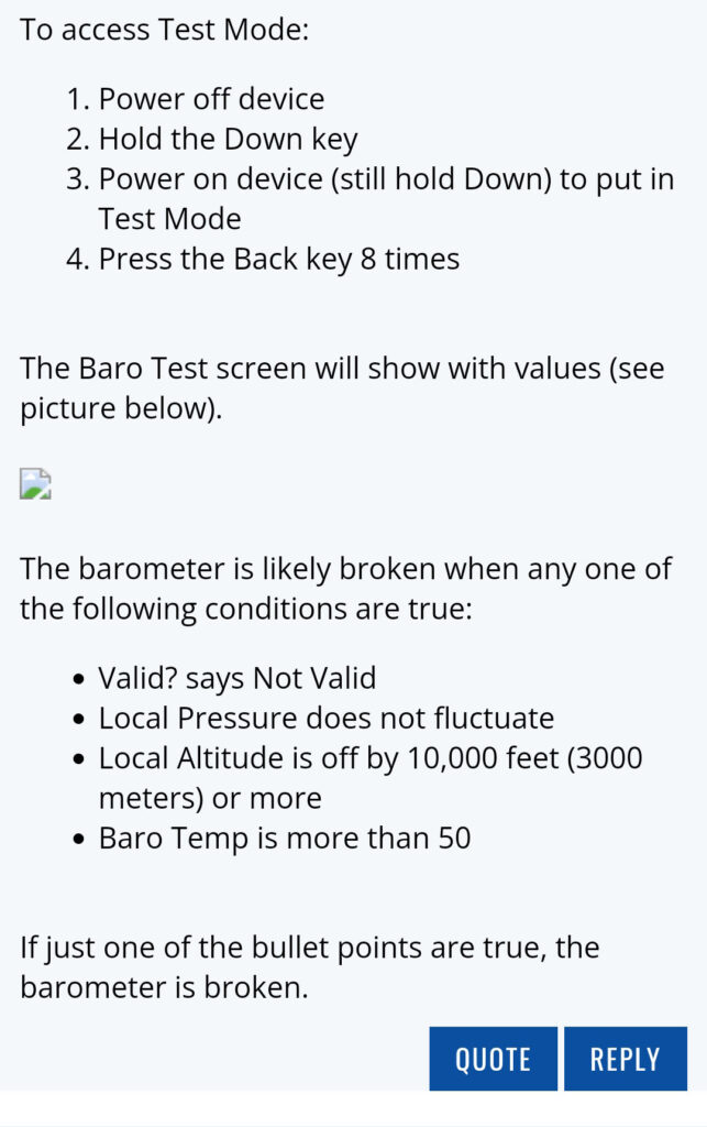 在网上查了很多资料,有些佳明的顾客说,佳明的高度计、气压计与温度计会出现问题,尤其是fenix5、fenix3与fenix3HR等几个机型,估计是早先的机型在工程设计上的问题。在国外佳明论坛上,找到了一种检测的方法。将设备进入工程模式,进行检测,找到Baro Test,以下的几项如果一项有问题,估计就是硬件的问题。Valid的值为Invalid, Local Press值不变动,Local Alt超过正常海拔的3000米, Baro Temp高于50。
