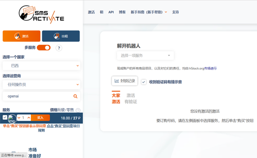 在https://sms-activate.org/cn注册帐号,选择支付宝充值0.2美元。找到合适的国家和服务,选择激活业务类别,不能选择出租业务。不忙点击购买,因为,一点击之后,号码只有20分钟的有效期,20分钟之后,没有完成注册,号码将会被回收。