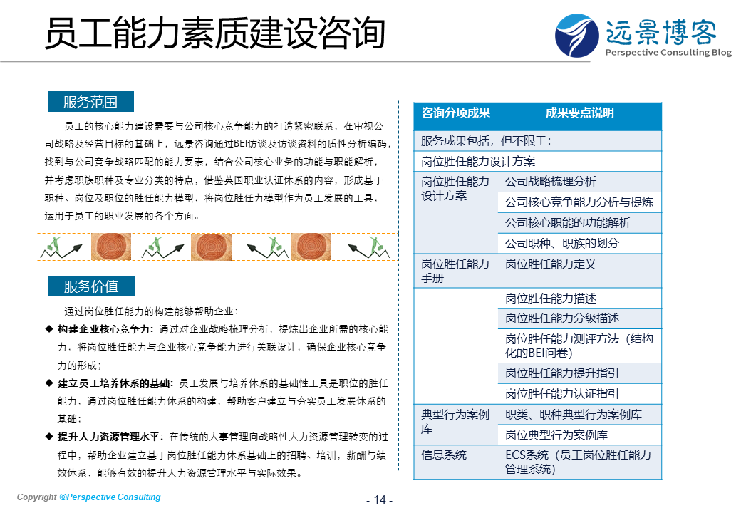 岗位胜任能力体系的建立是员工发展的基础,远景在掌握BEI访谈及心理探视技术( psychological probe)等经典的能力模型研究方法的基础上。结合职能解析及英国职业认证体系,为客户量身定制能够在员工发展方向使用的岗位胜任能力体系。从员工发展体系上看,企业普遍存在重培训轻培养的问题,针对员工不同的职业成长阶段,为形成多种培养方式,远景咨询在消化国外企业内部导师制与行动学习的基础上,将测评、培训、企业导师制及行动学习揉合,并借助信息管理系统落地实施,形成了镶嵌式的员工发展方法、理论及实践体系。 在员工发展咨询实践中,经过远景顾问服务及辅导的企业,建立了基于岗位胜任能力的全方位的人才培养体系,并采用科学的人才测评工具方法,使员工的发展真正具有了科学的依据与内涵,提升了员工整体的岗位胜任能力,增强了企业人力资本与市场竞争能力。