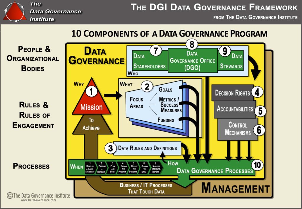 DGI 从数据治理组织结构、治理规则和治理过程三个维度提出了关于数据治理活动的 10 个关键要素,并在这些要素的基础上构建了数据治理框架。框架按照职能划分为三组:人员与组织机构、规则与协同工作规范、过程。
