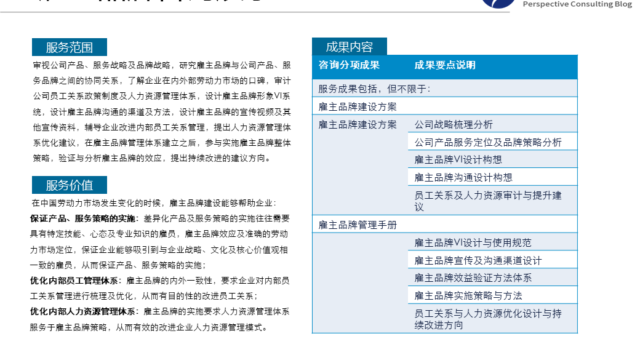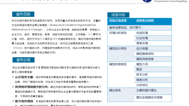 在组织发展咨询服务过程中,远景咨询组织绩效诊断采用国外组织绩效因果诊断模型( Burke-Litwin Model of Organizational Performance & Change)的原理及方法,并根据客户的实际情况进行调整。在组织变革的实施时,采用国外成熟的肯定式探询(AI)方法体系和客户一道研讨,形成变革的可行方案,促进组织深层次变革的演进与固化;在组织及流程分析咨询时,采用价值链模型及流程分类的国际标准框架(PCF)进行关键流程的分析与组织管控权限的设计;雇主品牌设计采用最新国外雇主品牌研究资料,结合国内劳动力市场的特点进行有针对性的设计。 在学习西方组织发展(organization  development)经典管理咨询方法工具的基础上,结合本土管理咨询实践,揉合了教练技术及行动学习等实施方法,形成了远景顾问独具特色的组织发展管理咨询理念与方法体系,具有熟练辅导企业进行组织变革的能力。在组织发展咨询实践中,经过远景咨询服务及辅导的企业,明显的提升了组织发展的活力,明显的提升了组织对环境的适应性,明显的提升了企业根据自身环境进行组织变革的能力,促进了企业长期持续稳定发展。以下是远景顾问承担的咨询委托的项目总结性展示,希望对读者的工作有所帮助。